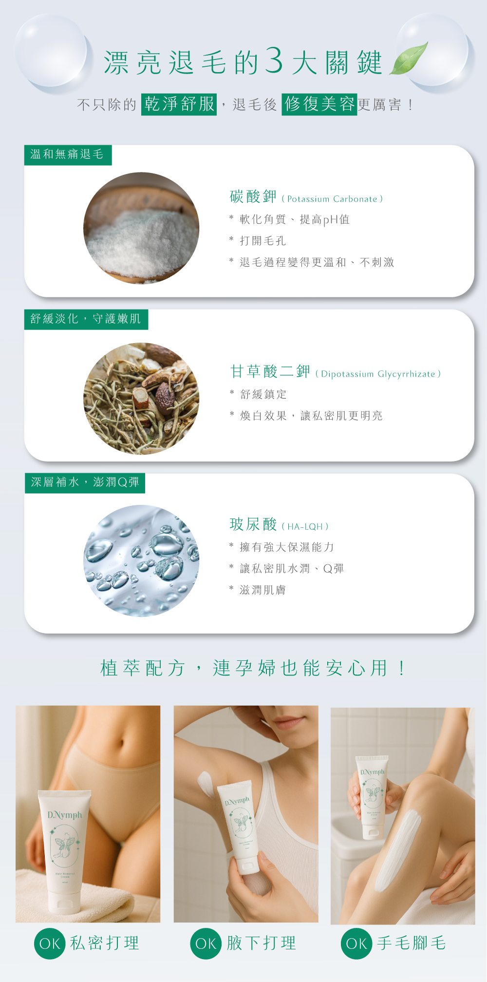 內含【碳酸鉀】,軟化角質,幫助毛孔舒展,脫毛更溫和