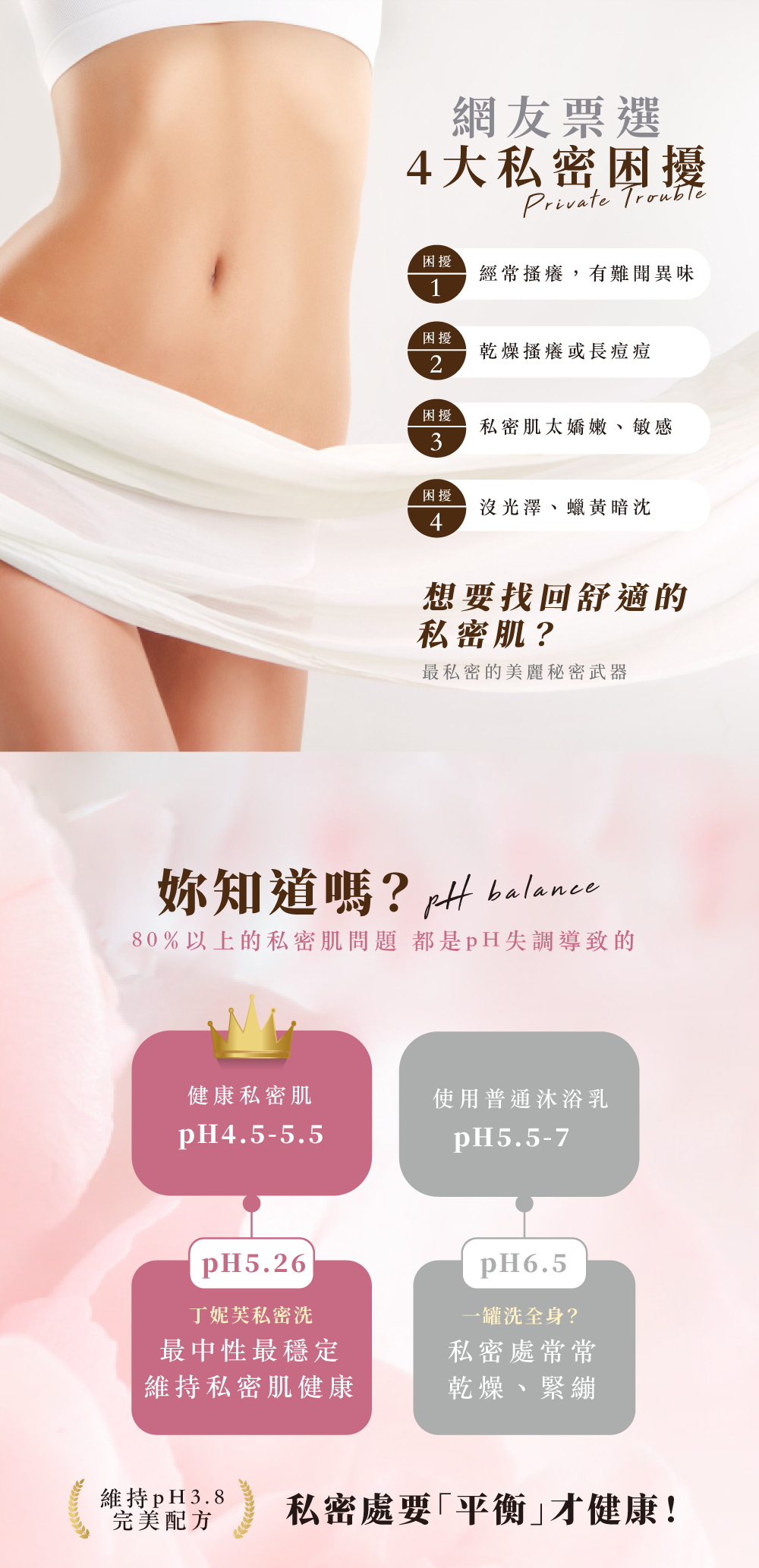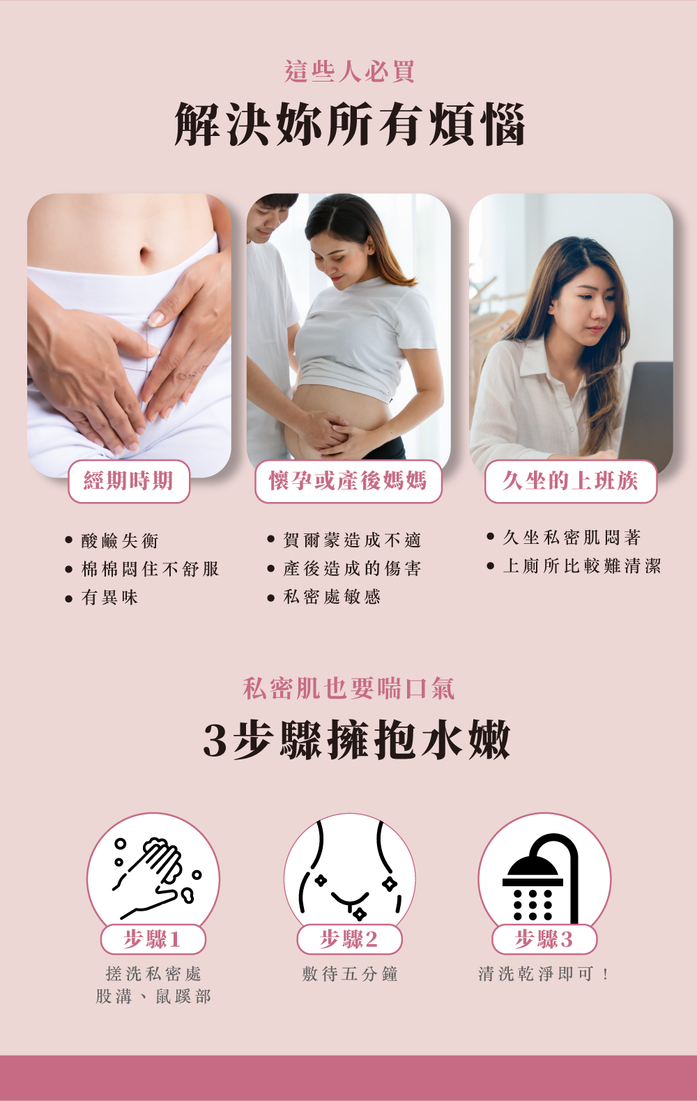 在經期前後、懷孕期、藥物使用、發生性行為,或是穿著緊身的褲子造成私密處悶熱的情況下,都可能造成陰道酸鹼值的改變,而導致種種不適症狀與感染,私密處的外部結構有許多皺摺,較容易藏污納垢,加上台灣氣候潮濕;因此,私密處清潔用品的挑選也更為重要💯